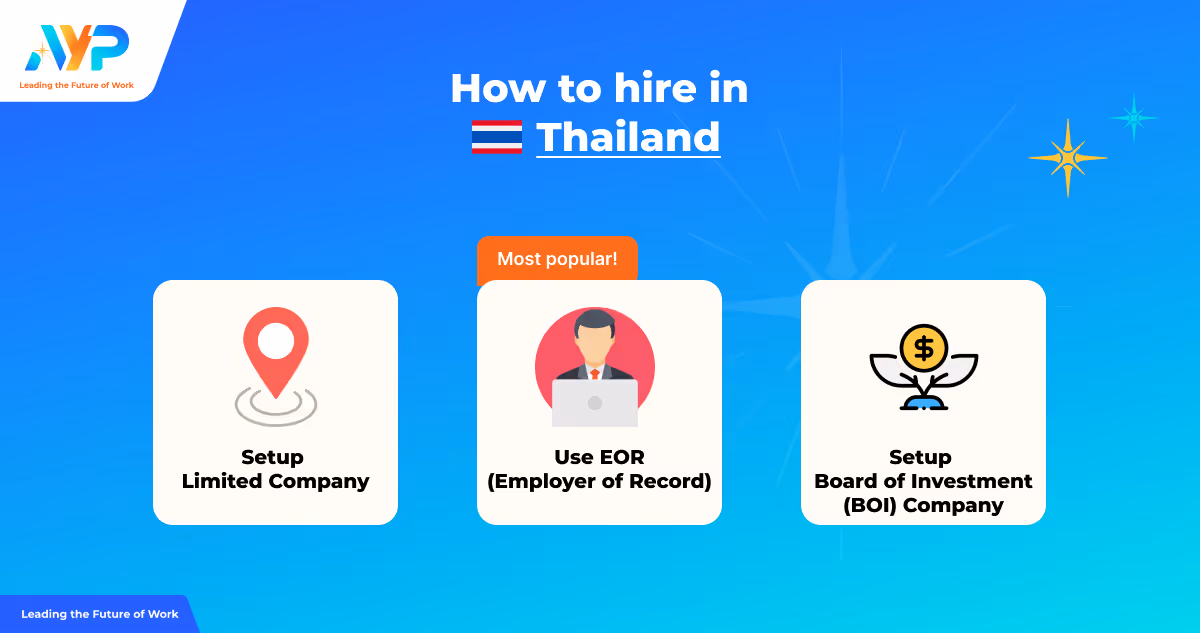 International companies planning to employ workers Thailand have several strategic options, each offering different advantages in terms of operational control, setup complexity, and investment requirements. Thailand's welcoming business environment provides multiple pathways for market entry.
